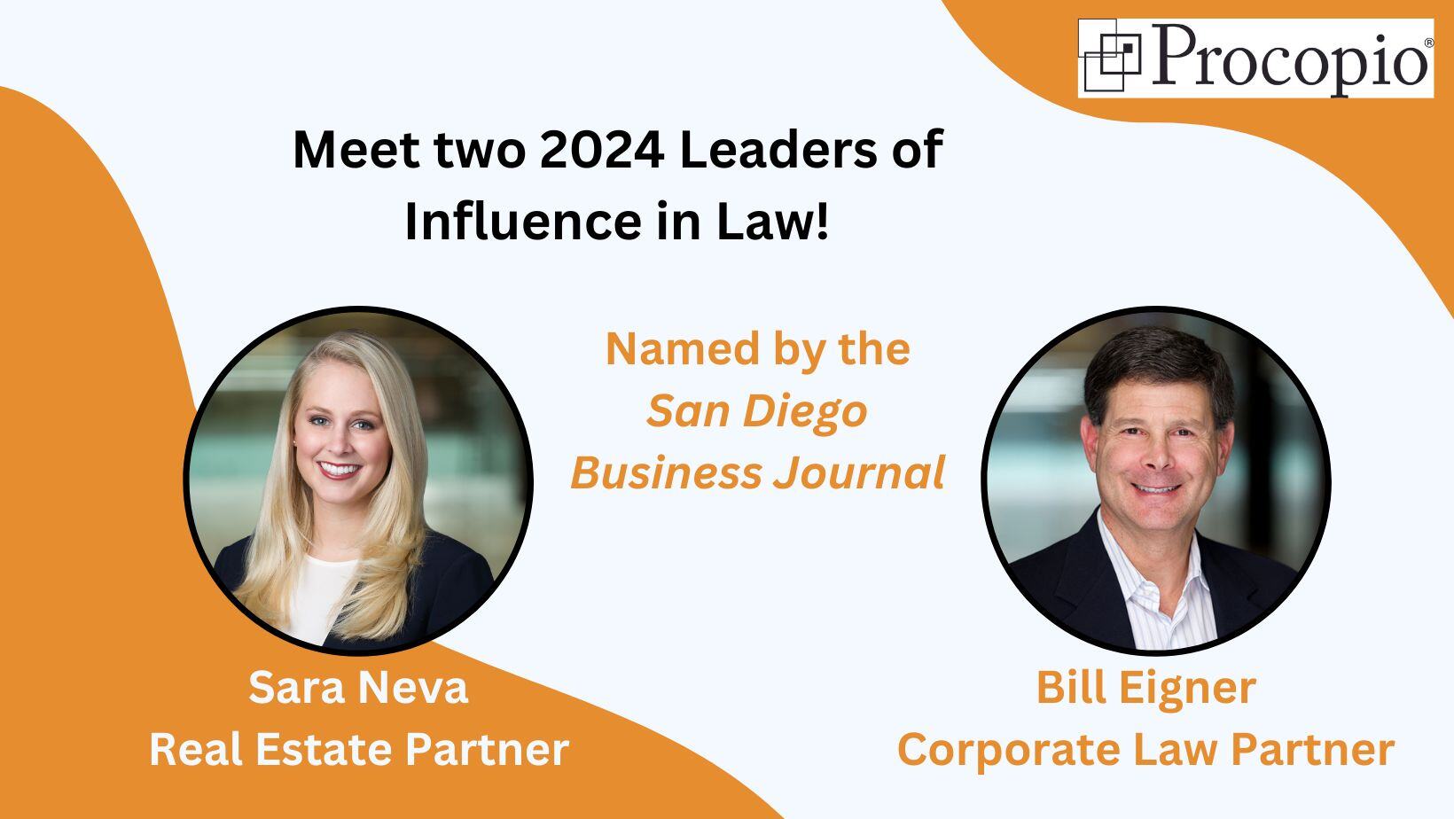 Kudos to Procopio Partners Sara Neva and Bill Eigner on being named 2024 Leaders of Influence in Law by the San Diego Business Journal! The list comprises some of San Diego’s most influential and experienced law firm and in-house attorneys, and is selected by an outside group of legal experts. Sara and Bill have each appeared on the list multiple times.