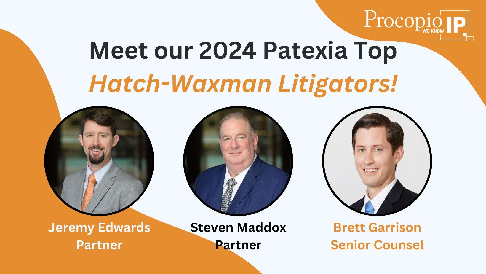 Procopio’s Life SciencesIntellectual Property Litigation practice and three of its attorneys were recognized by Patexia for outstanding performance in Hatch-Waxman/ANDA Litigation in multiple categories. In addition, Procopio was named a Top 10 law firm out of more than 220 firms. Partners Jeremy Edwards and Steven Maddox ranked in the Top 25 out of nearly 2,000 attorneys, and Senior Counsel Brett Garrison ranked in the Top 100. Jeremy, Steven and Brett are all based in Procopio’s Washington, D.C., office.